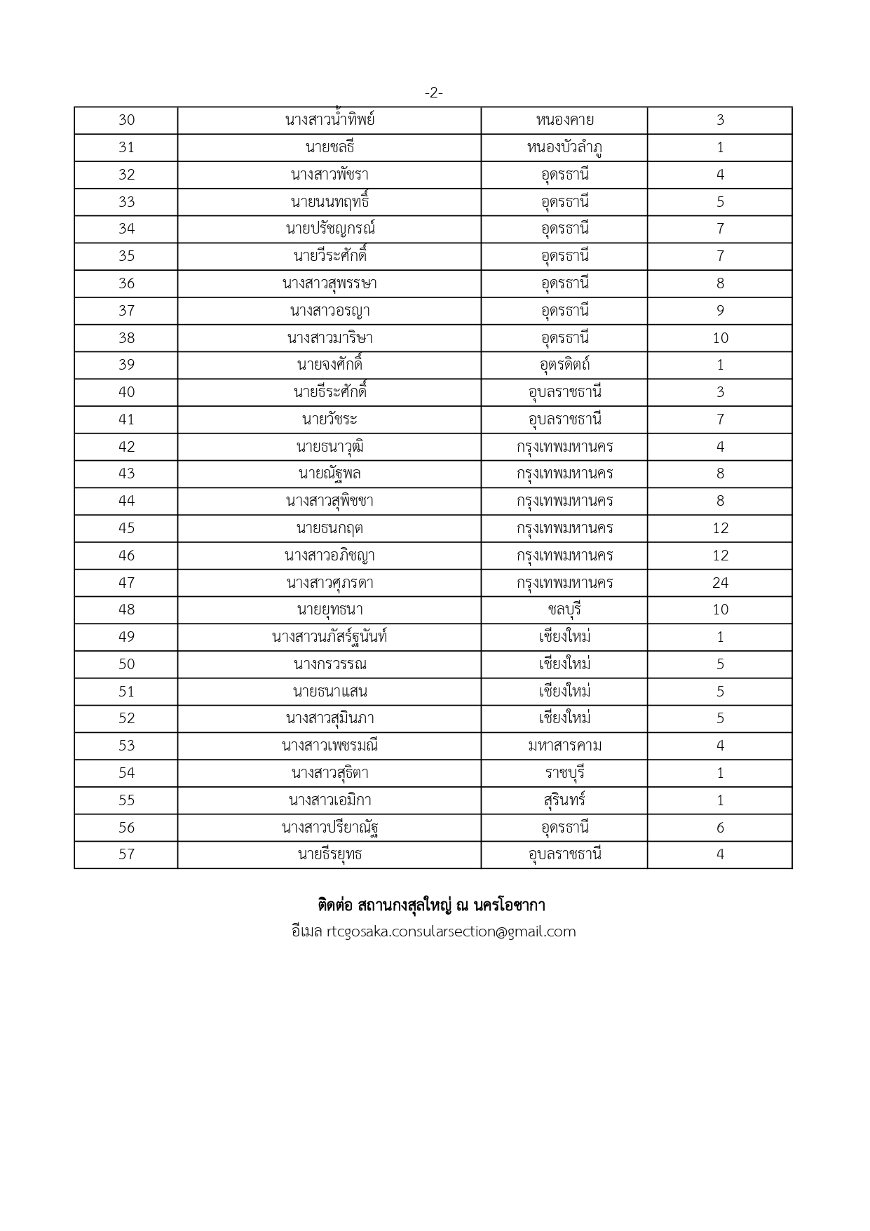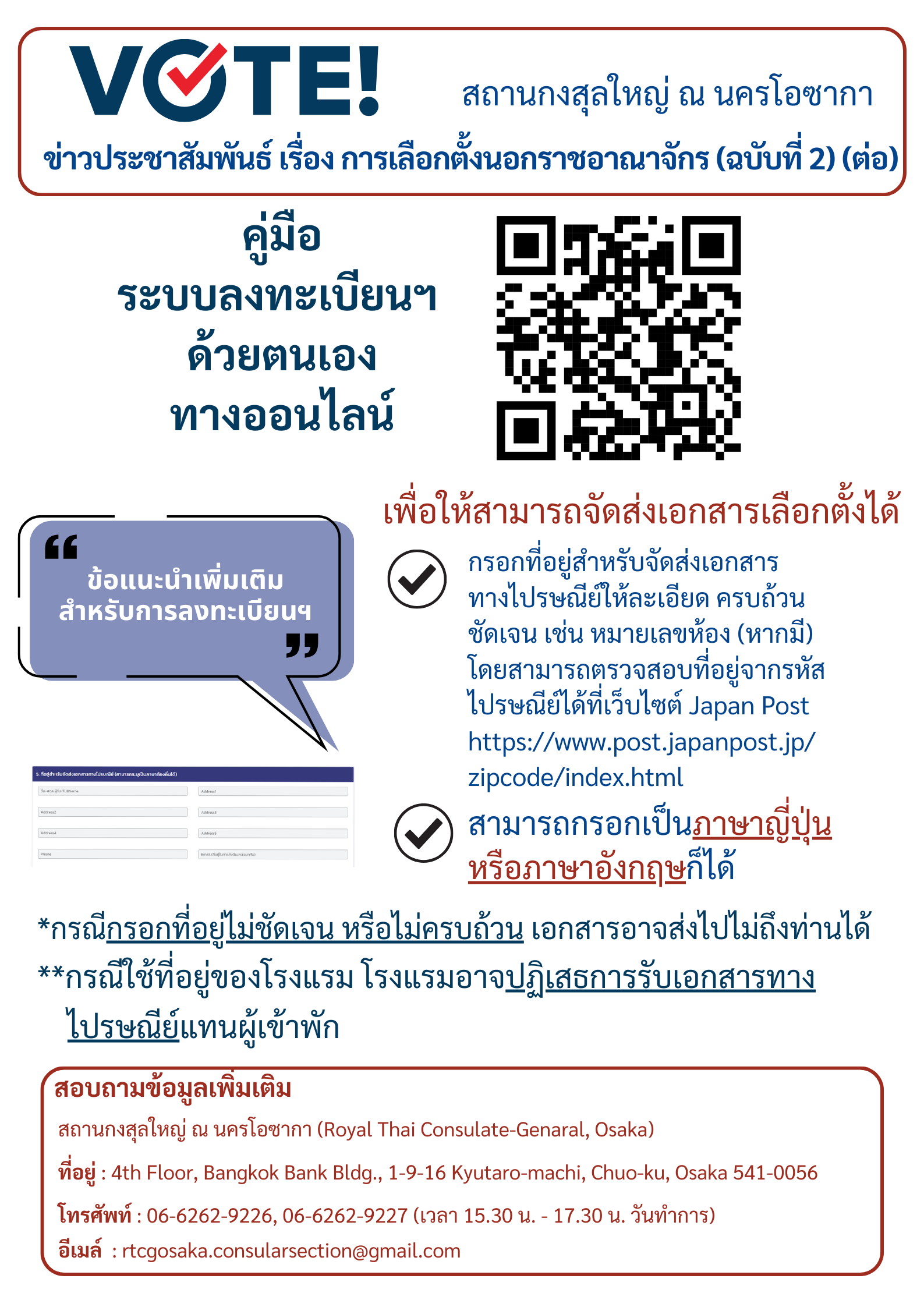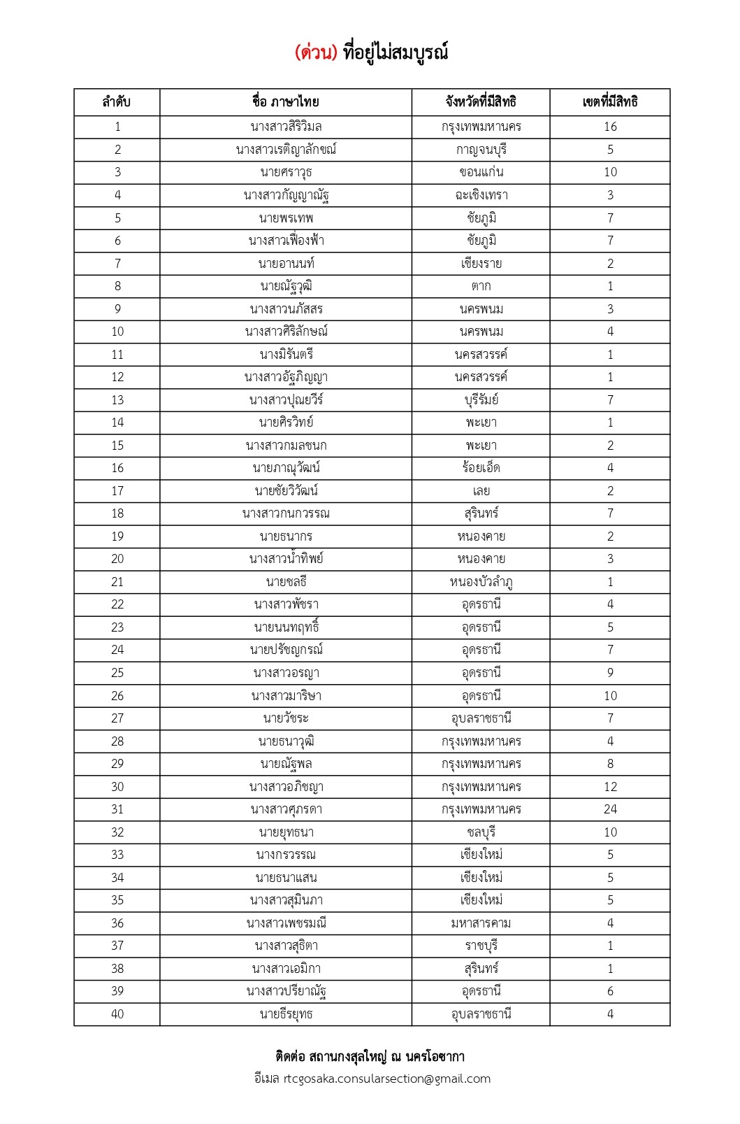 เรียน ผู้มีสิทธิเลือกตั้ง และ/หรือ ออกเสียงประชามติ ที่ลงทะเบียนใช้สิทธิกับสถานกงสุลใหญ่ ณ นครโอซากา ที่มีรายชื่อดังต่อไปนี้