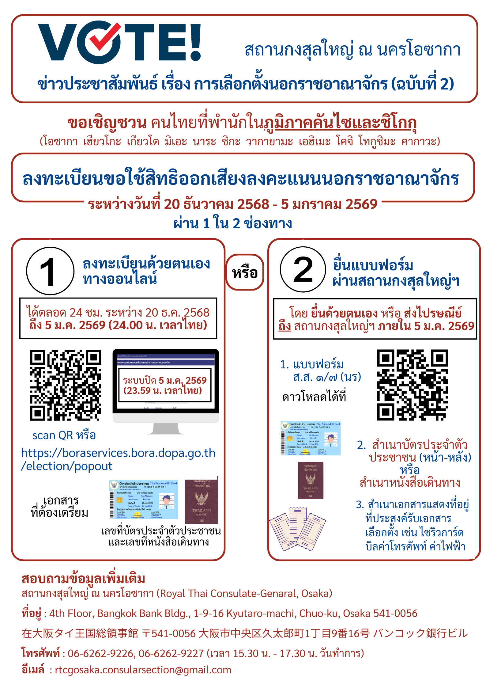 ดังนั้น โปรดมาติดต่อขอรับเอกสารสำหรับเลือกตั้ง และ/หรือ ออกเสียงประชามติ ด้วยตนเองที่ สถานกงสุลใหญ่ ณ นครโอซากา โดยด่วน โดยนำบัตรประชาชน (ไทย) หรือ สำเนาหนังสือเดินทาง (ไทย) ตัวจริง มาแสดงตนด้วย
