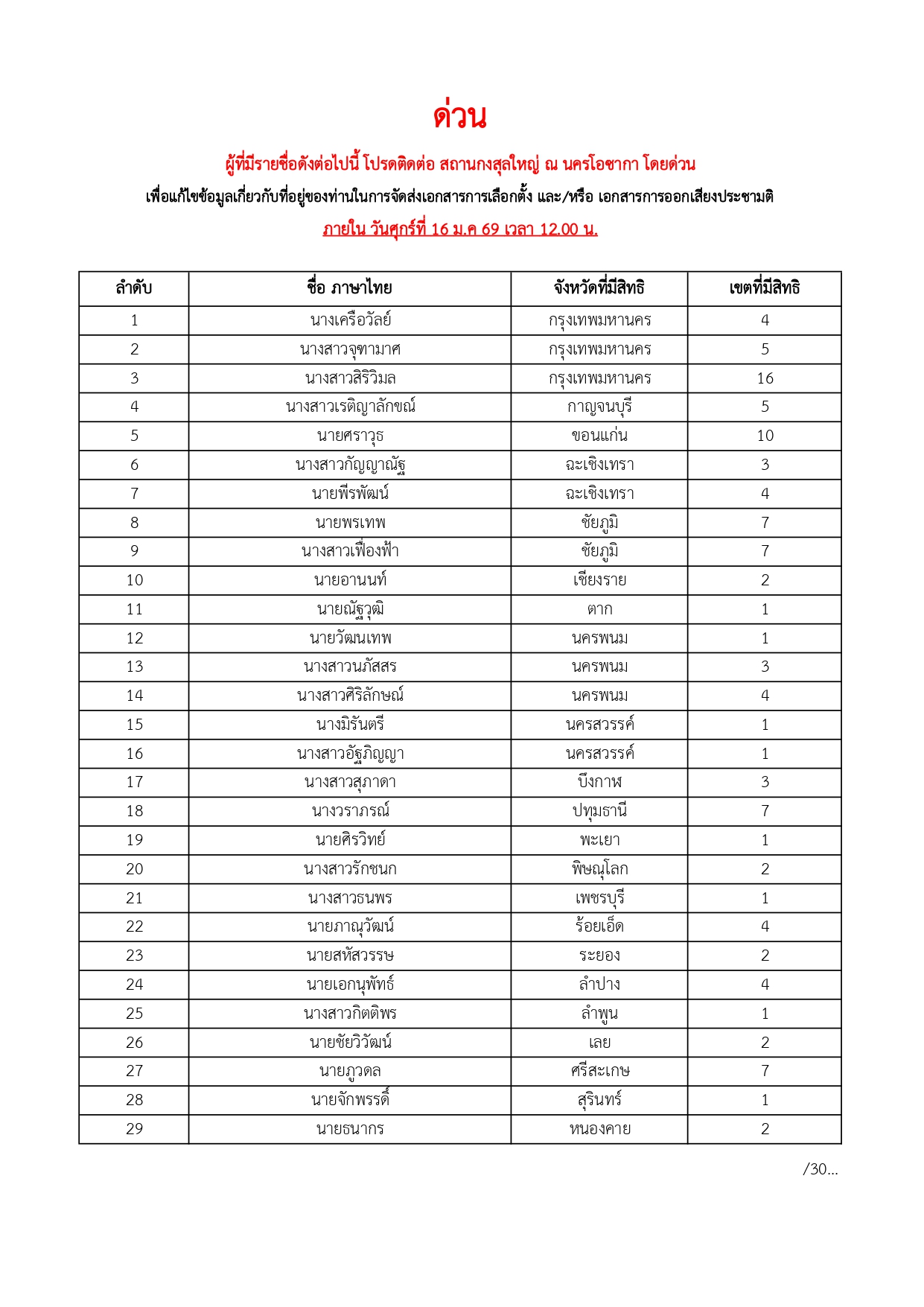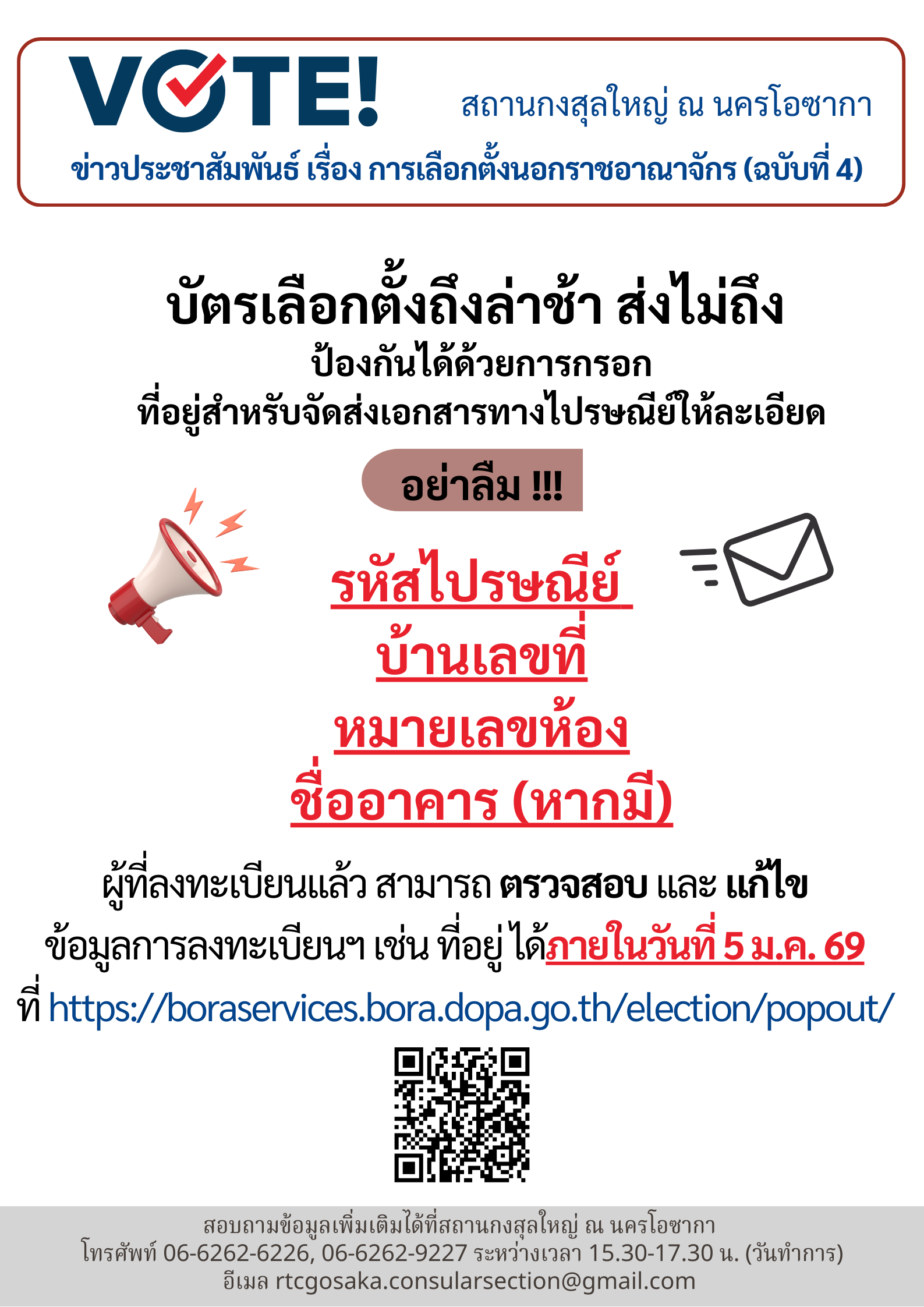 ขอแจ้งให้ผู้ที่มีชื่อดังต่อไปนี้ โปรดรีบติดต่อสถานกงสุลใหญ่ ฯ ทางอีเมล [email protected] เพื่อแก้ไขข้อมูลเกี่ยวกับที่อยู่ของท่านในการจัดส่งเอกสารการเลือกตั้ง และ/หรือ เอกสารการออกเสียงประชามติ ภายในวันศุกร์ที่ 16 ม.ค. 2569 เวลา 12.00 น.