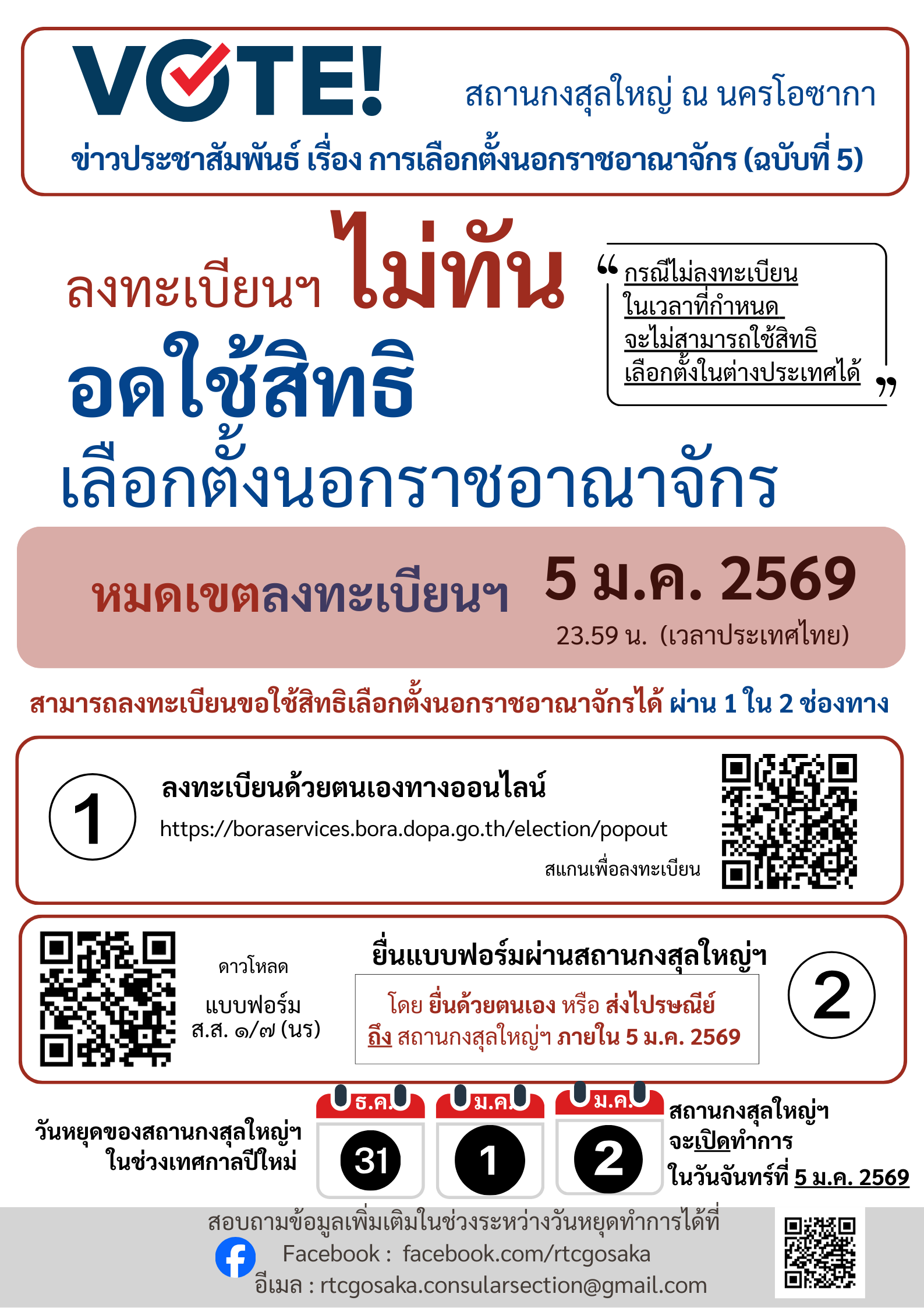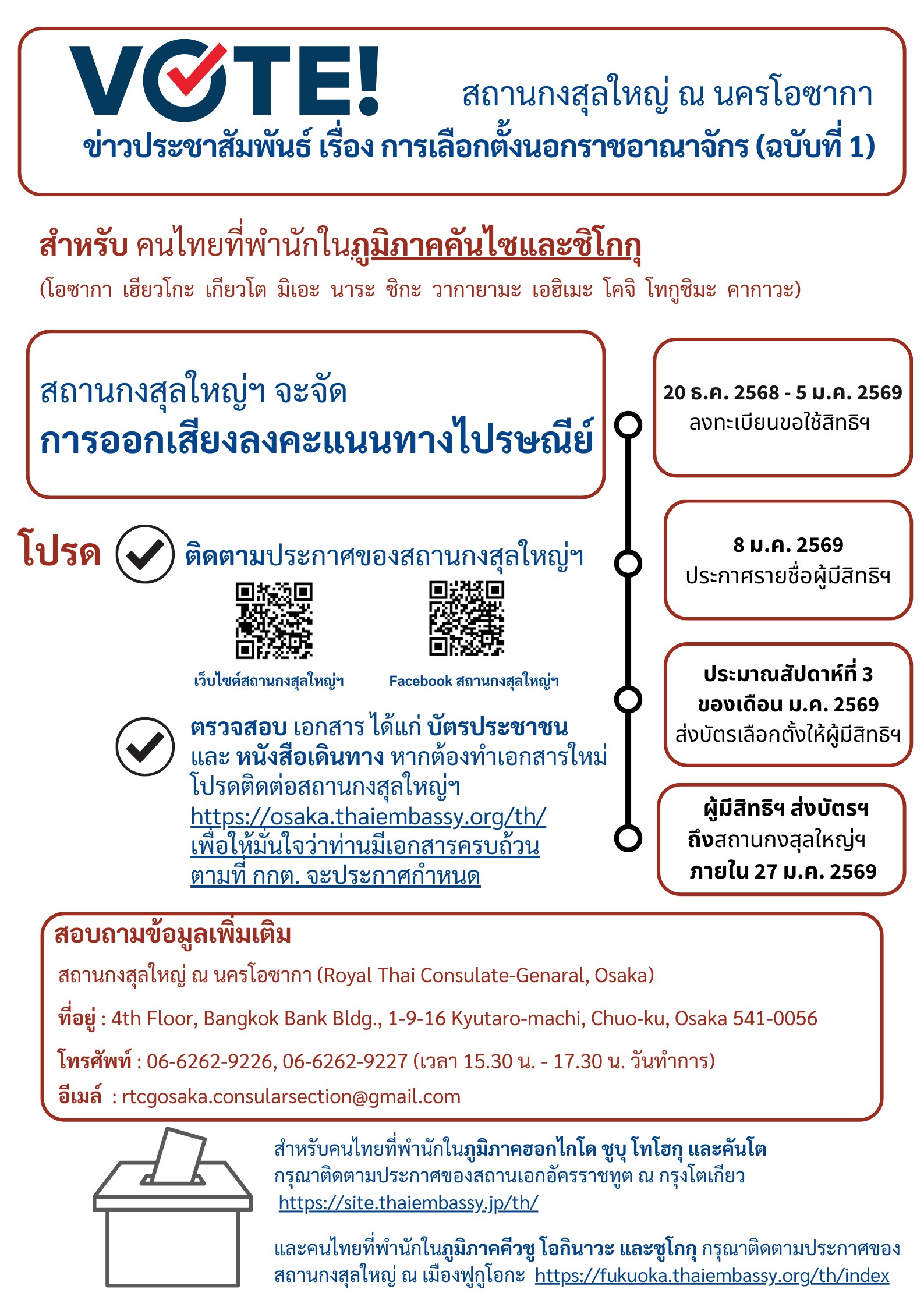 สถานกงสุลใหญ่ ณ นครโอซากา ได้เริ่มจัดส่งเอกสาร การเลือกตั้งและการออกเสียงประชามติ นอกราชอาณาจักรให้แก่ผู้มีสิทธิ ฯ ที่ลงทะเบียนโดยเลือก สถานกงสุลใหญ่ ณ นครโอซากา แล้ว